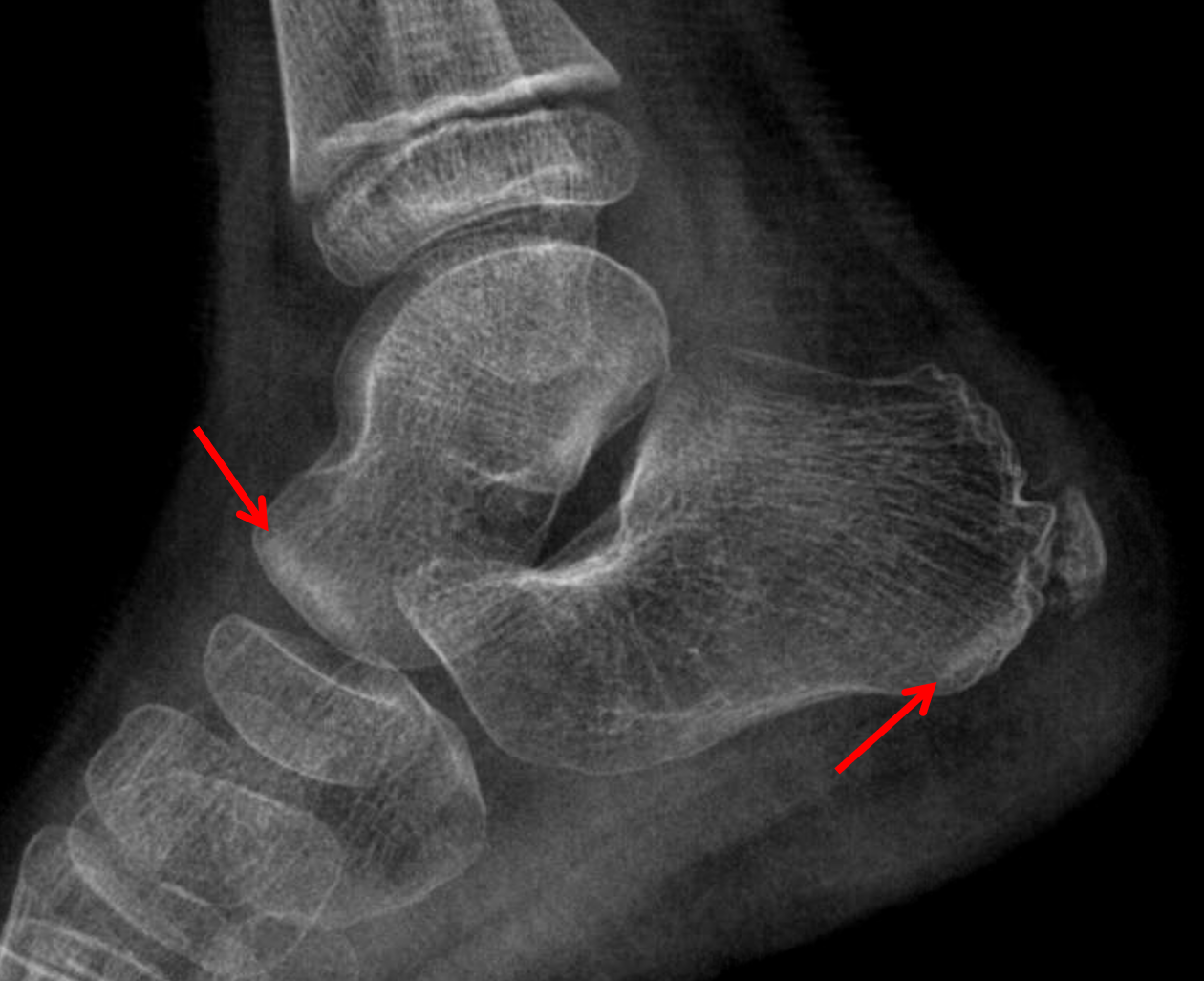 Bands of sclerosis in the distal talus and plantar aspect of the posterior calcaneus are concerning for stress fractures. No acute displaced fracture.