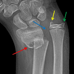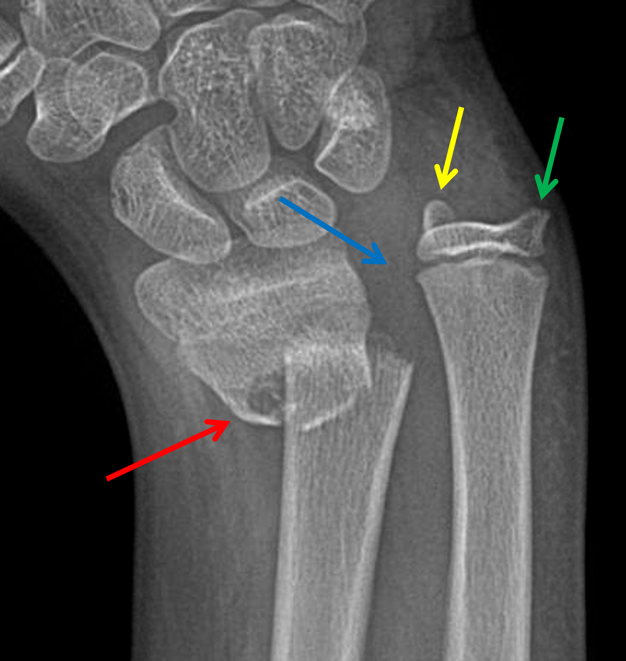 Acute ulnar styloid fracture with the fracture fragment displaced to the radial margin of the ulna.