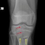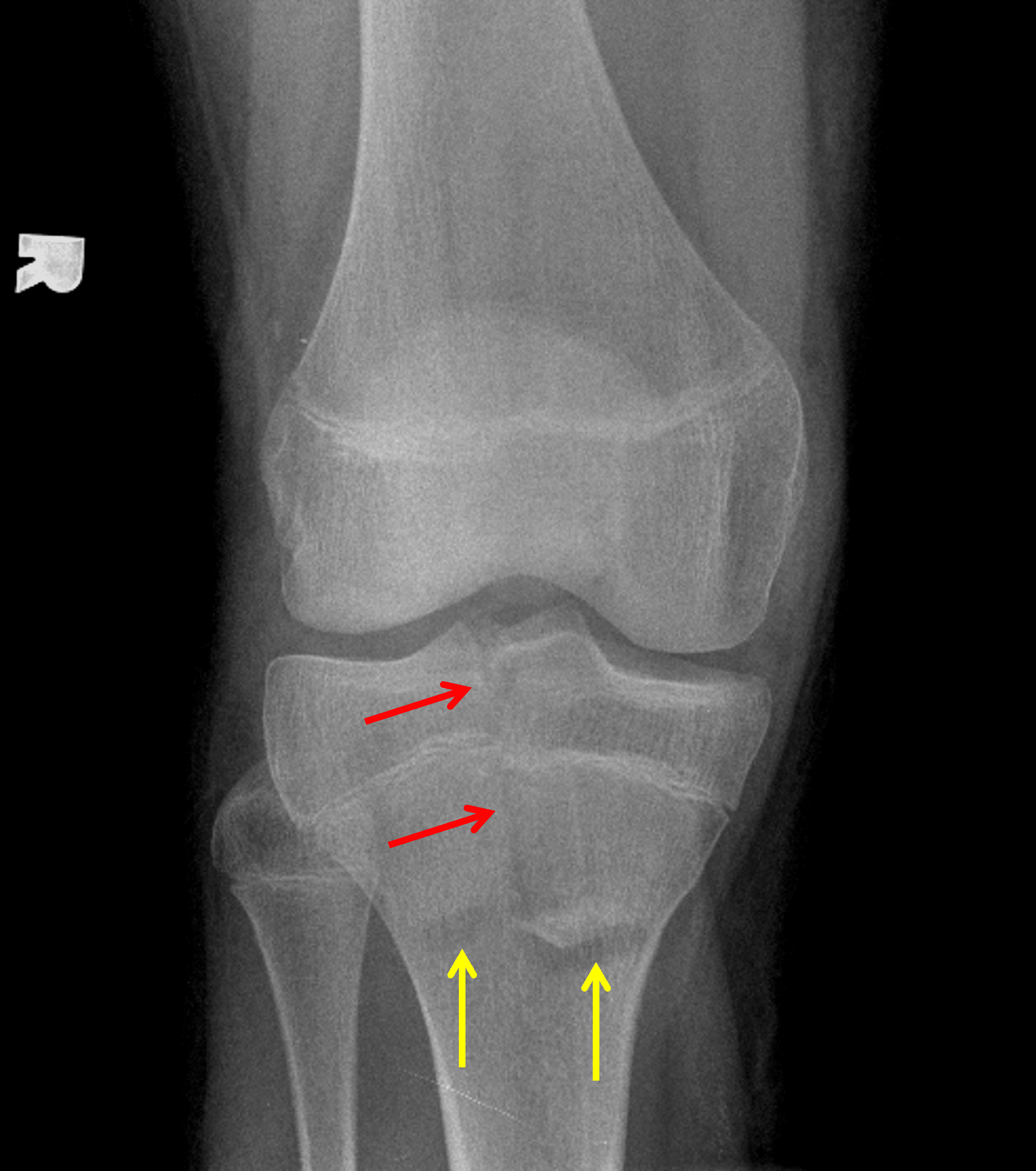 Sample ReportAcute minimally displaced, vertically-oriented fracture extending from the tibial spines through the proximal tibial physis (Salter IV), which is in continuity with a complete transverse fracture of the proximal tibial metaphysis. No depression of the tibial plateaus.