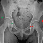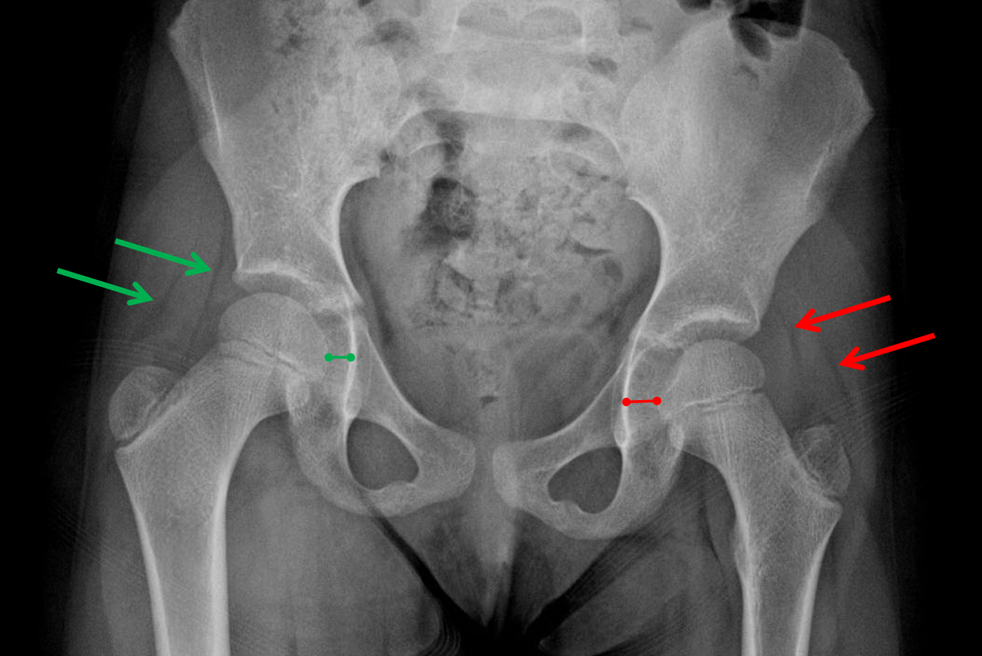 Asymmetry of the fat planes overlying the left hip (red arrows) relative to the right (green arrows). Asymmetric teardrop distance widening on the left (red line) vs the right (green line).
