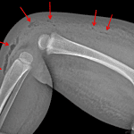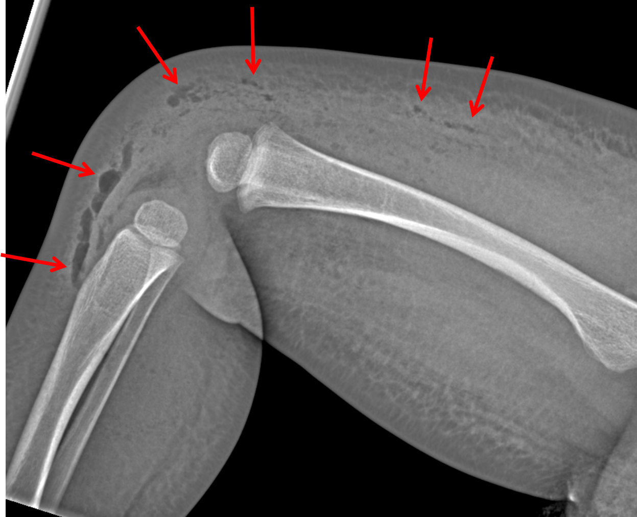 Sample ReportExtensive fat stranding and edema involving the right hip, thigh, and knee with locules of gas tracking along deep fascial planes from the anterolateral knee proximally to the mid thigh. Findings are concerning for cellulitis and possible necrotizing fasciitis. Recommend surgical consultation.