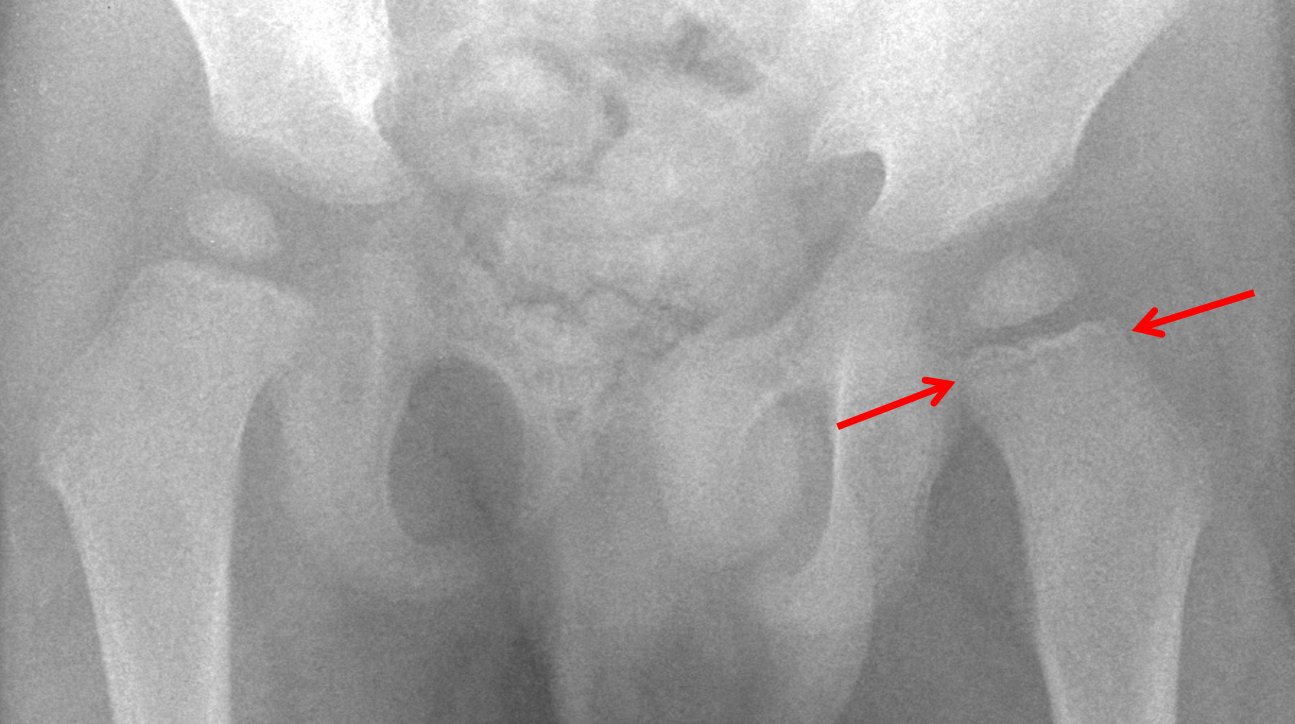 Red arrows: subtle lucent metaphyseal band.