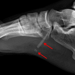 • Triangular radiopaque foreign body measuring 3 x 0.5 cm in the plantar soft tissues of the lateral midfoot adjacent to the fifth metatarsal base