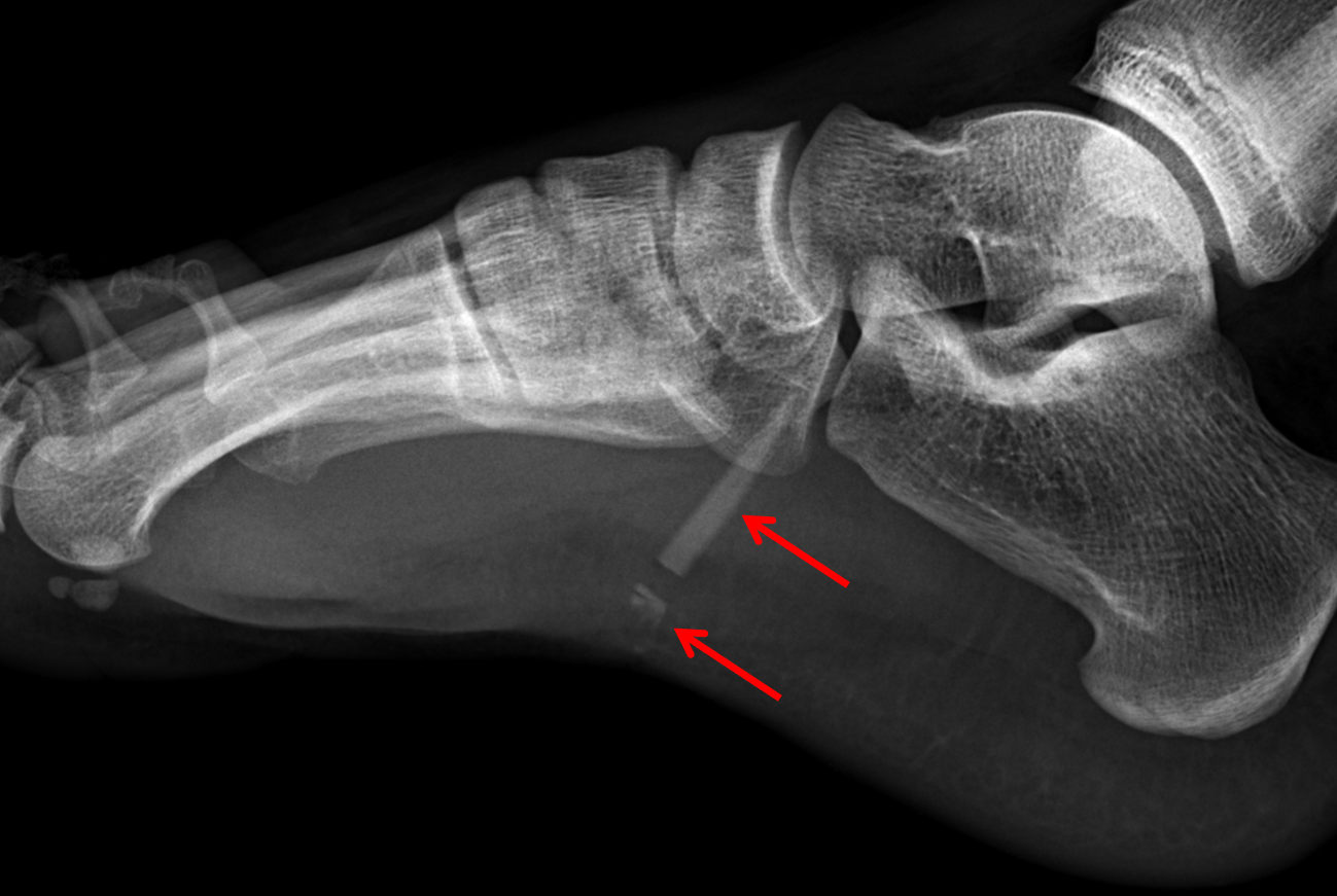 Triangular radiopaque foreign body measuring 3 x 0.5 cm in the plantar soft tissues adjacent to the fifth metatarsal base and adjacent 0.8 cm rectangular foreign body just inferior to the larger fragment, approximately 0.5 cm deep to the plantar skin surface.