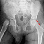 Right slipped capital femoral epiphysis (SCFE) with widening of the physis, internal rotation of the femoral epiphysis, and lateral displacement of the femur.
