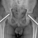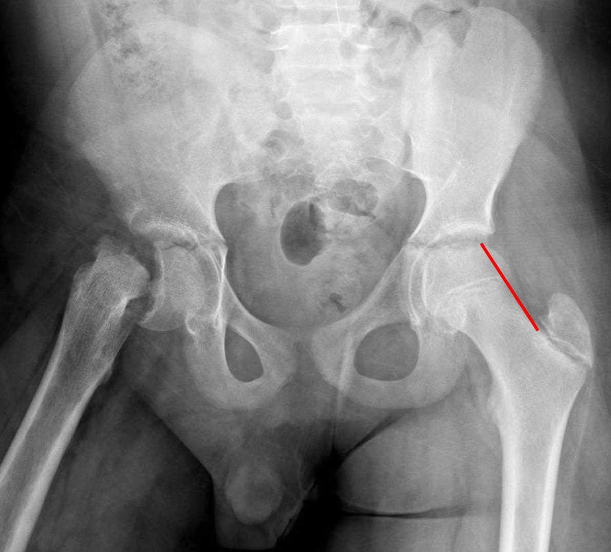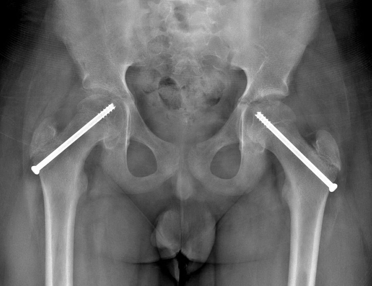 Displaced right Slipped capital femoral epiphysis (SCFE). Normal appearance of the left femoral head with Klein's line (red line) intersecting the left femoral head. Followup radiograph in this patient after bilateral hip pinning.
