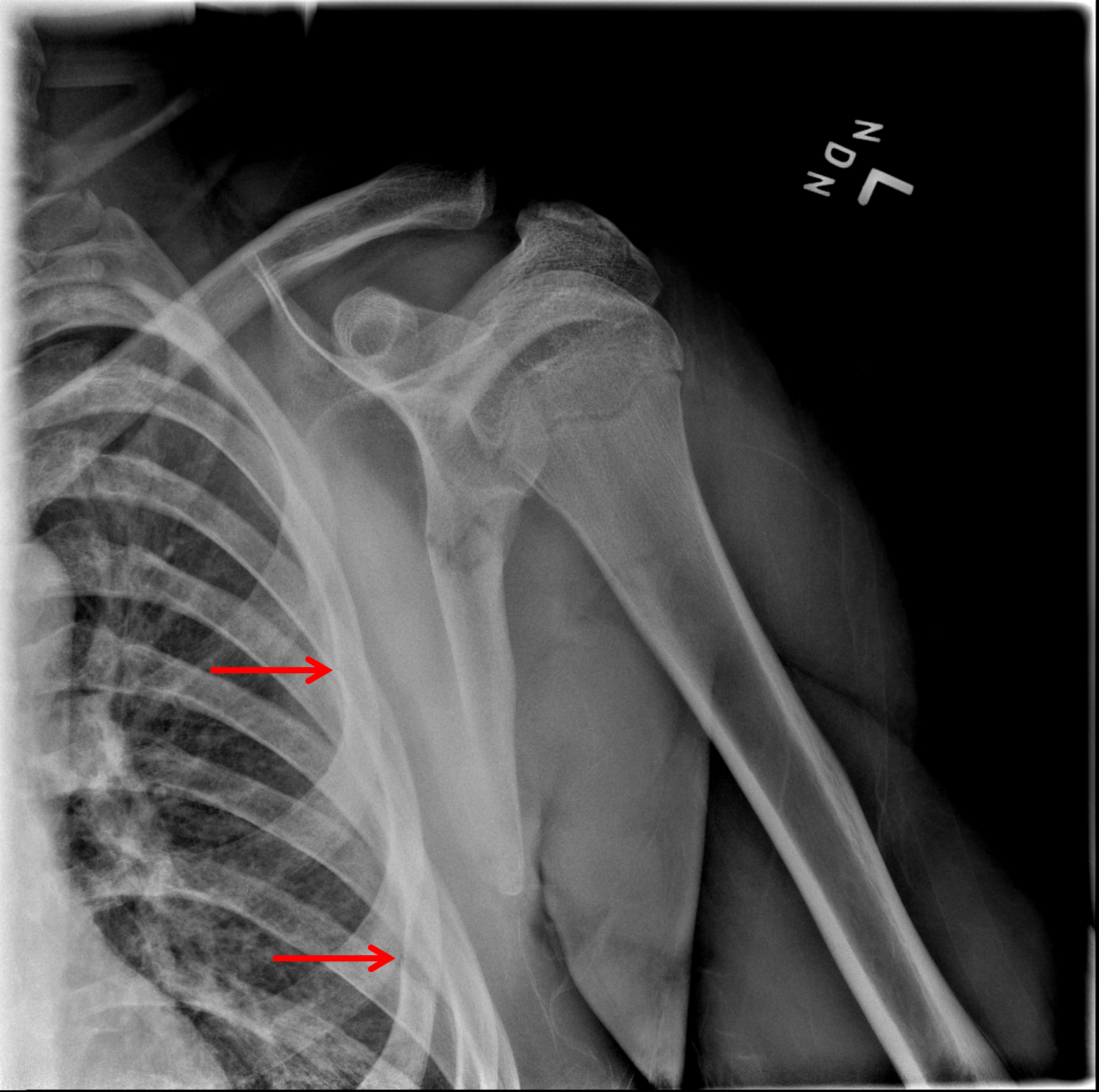 Acute nondisplaced fractures of the left lateral third and fifth ribs (red arrows).