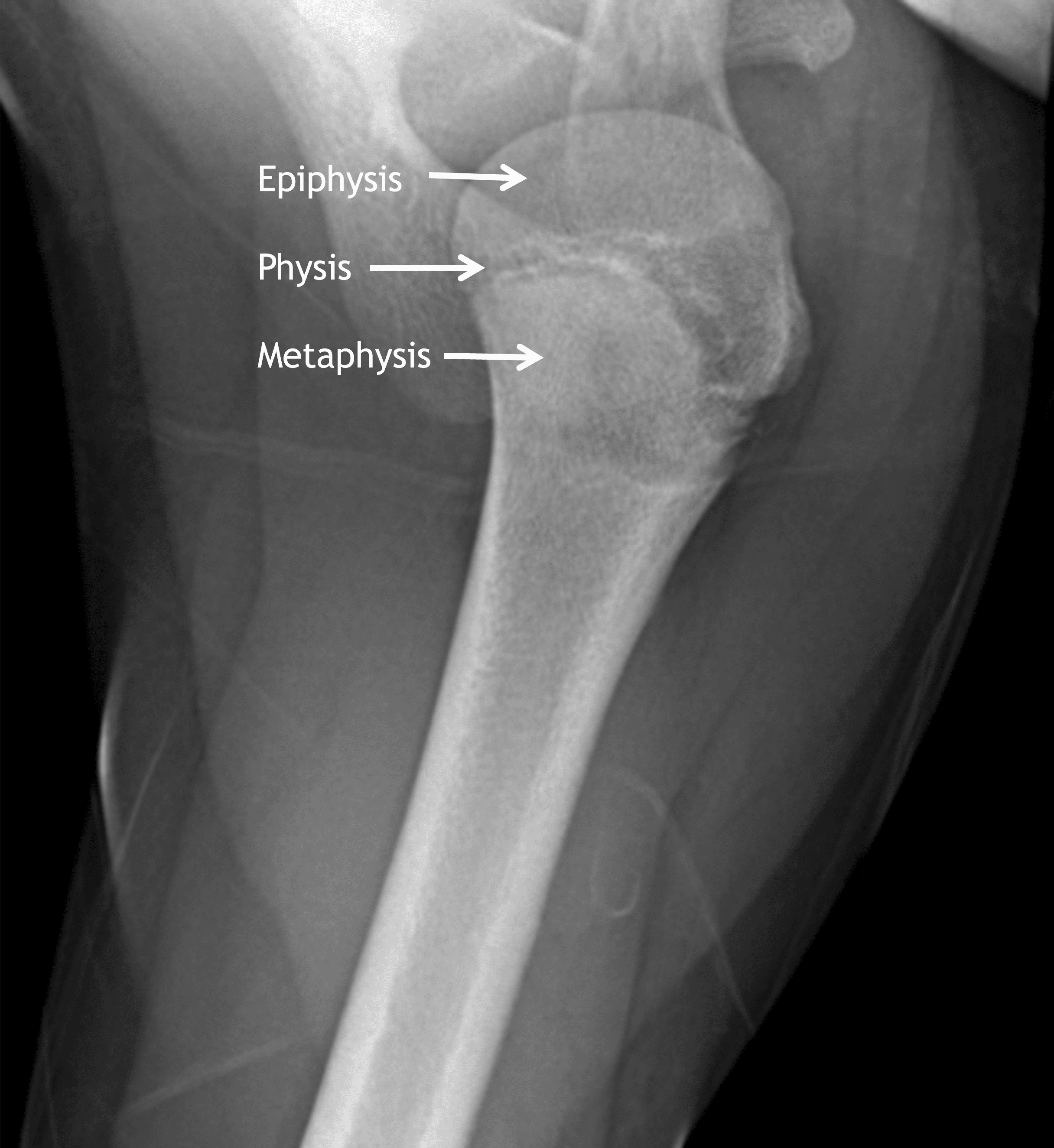 Arrows indicate the proximal humeral epiphysis, physis (lucent line), and metaphysis.