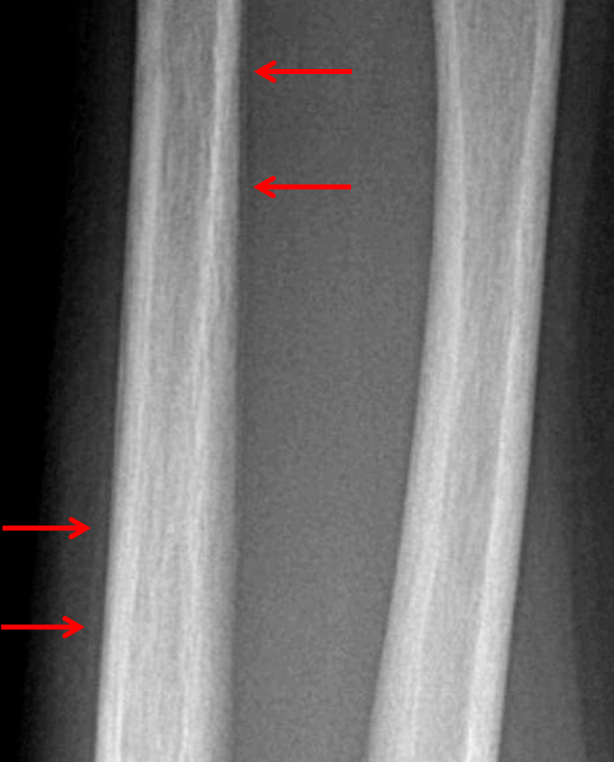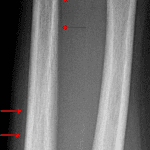 Followup radiographs obtained one month later in this patient show subtle periosteal reaction around the ulna (red arrows) indicating healing changes from bowing fractures.