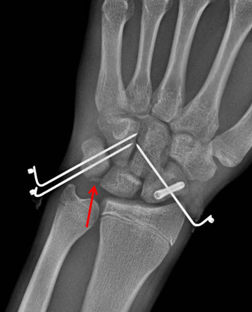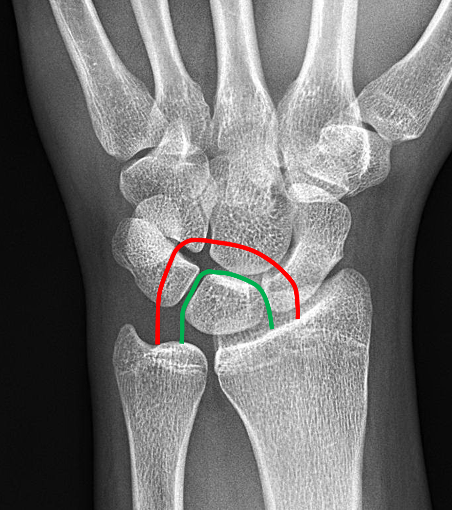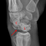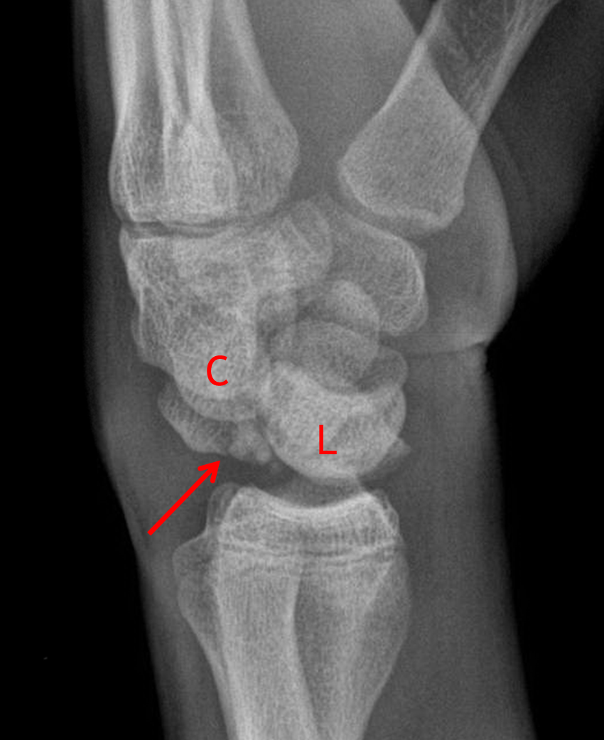 A fracture fragment along and dorsal margin of the lunate in the lateral view is of unclear source and could relate to the scaphoid fracture.