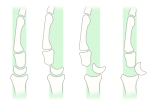 Greater arc carpal dislocations in order of severity from left to right. Far left: normal. Left center: perilunate dislocation. Right center: midcarpal dislocation. Far right: lunate dislocation.