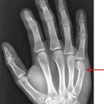 Red arrow: Boxer's fracture of the fifth metacarpal neck.