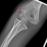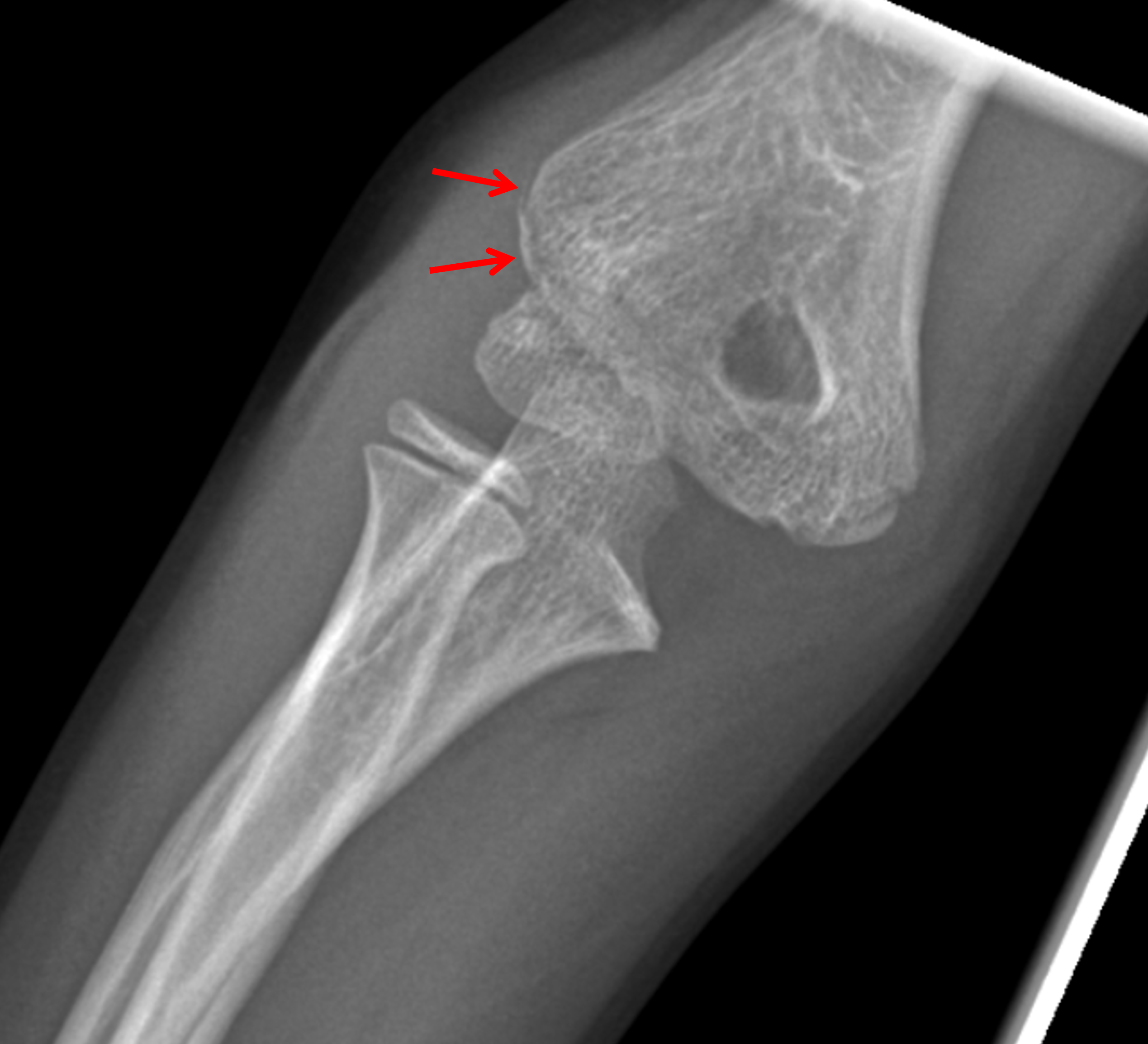 Acute minimally displaced lateral condylar fracture (red arrows).