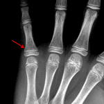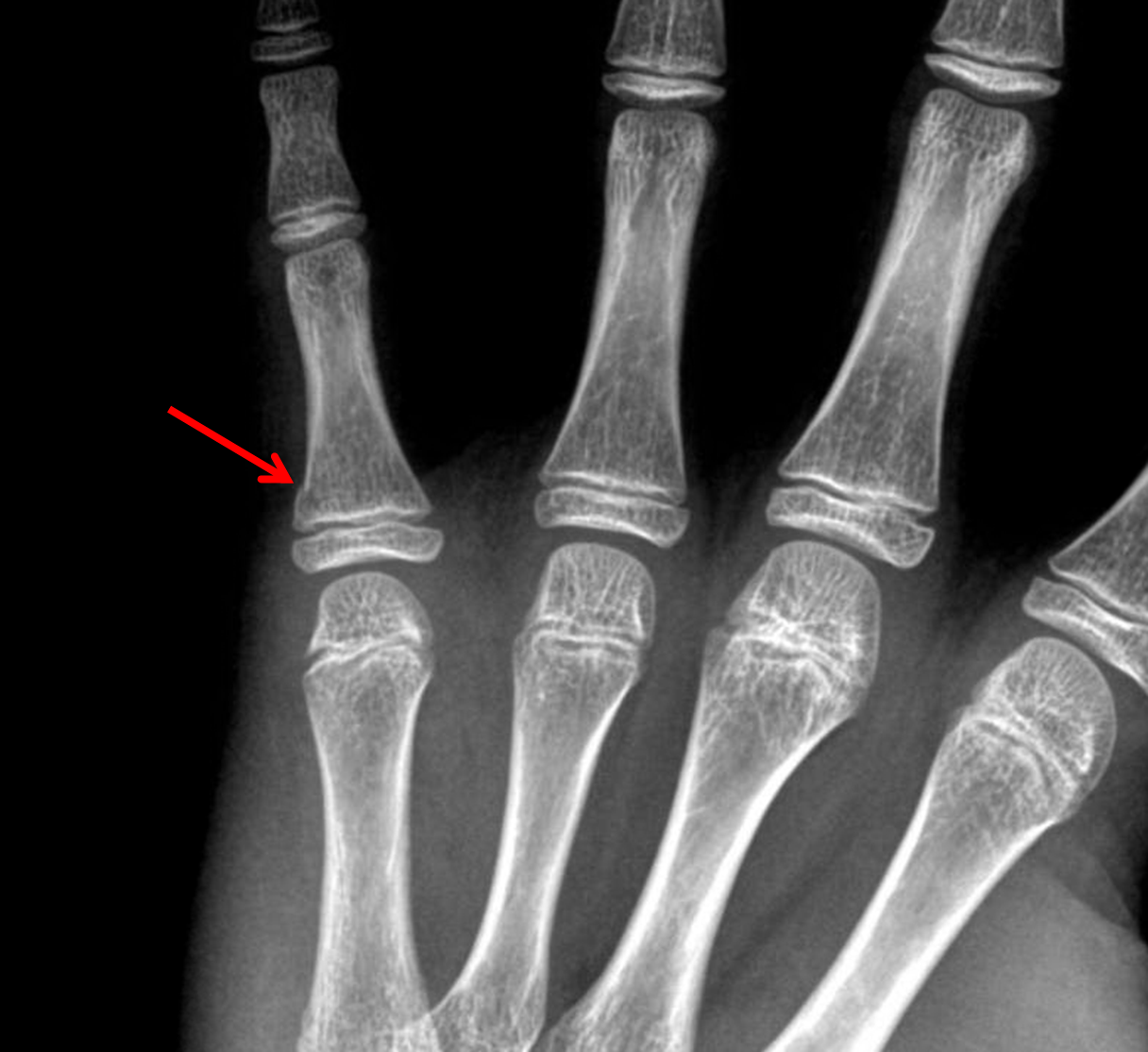 Sample ReportAcute nondisplaced Salter II fracture at the ulnar base of the fifth proximal phalanx with overlying soft tissue swelling.